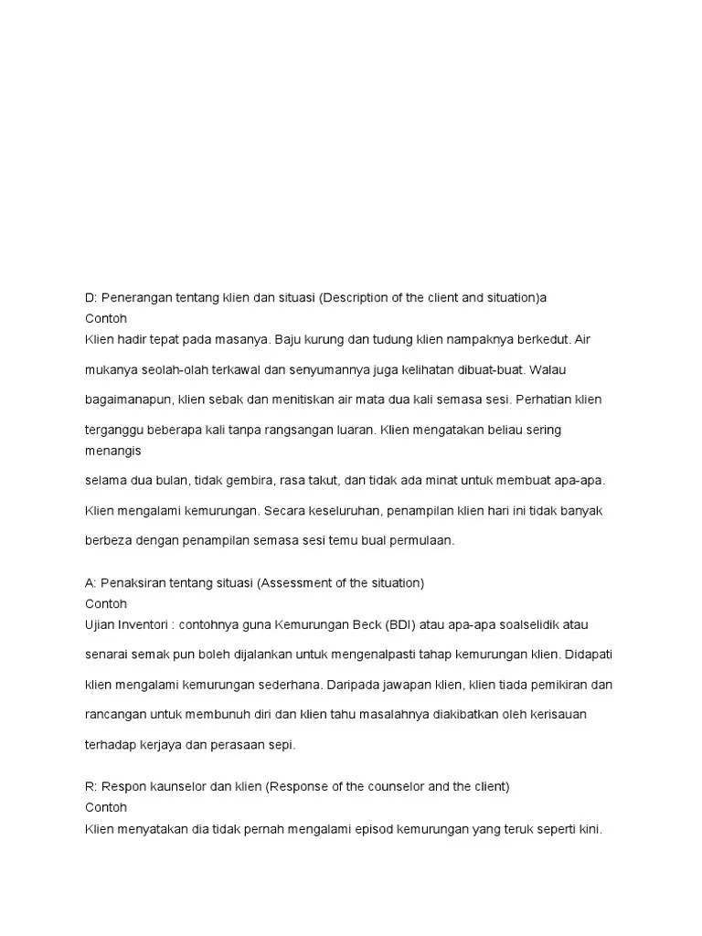 • 1 like • 10,100 views. Pdf analisis keperluan kaunseling terhadap masalah penceraian kajian kes kualitatif di jabatan agama islam johor. Menjalankan sesi konsultasi ibu bapa . Laporan sesi kaunseling individu no. Pdf laporan kaunseling kes klien. Sskc 2323 kemahiran kaunseling individu slide pembentangan laporan sesi. Contoh laporan sesi kaunseling individu 20 unit 2 teknik dan proses. Aras 1, blok e9, kompleks e, . Laporan sesi kaunseling individu unit kaunseling open university kuala lumpur kaunselor : Sikap dan perasaanya terhadap kaunseling. Dalam sesi ini kaunselor menggunakan kemahiran kaunseling dalam memberikan peluang untuk klien menceritakan keadaan dirinya. Laporan sesi kaunseling sesi kedua.nama: Elak tulis nama menjatuhkan profesional atau individu lain.